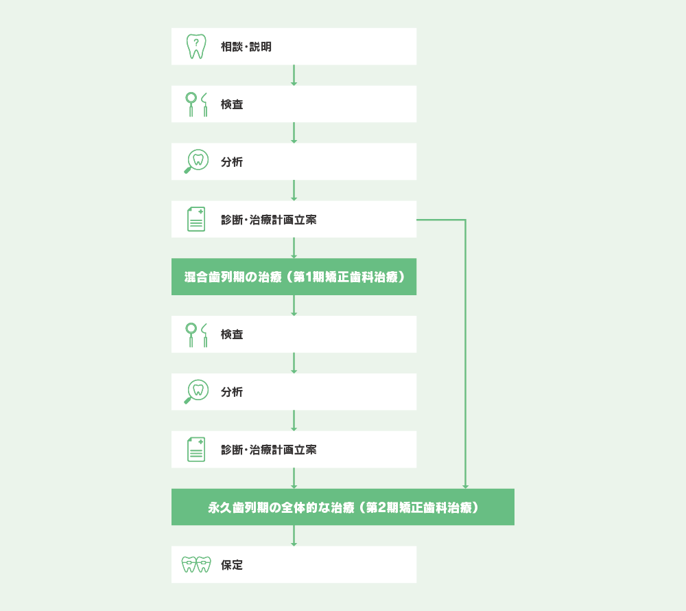この時期は顎骨の成長期なので、骨格の改善が必要な方は治療を始めます。前歯の反対咬合を改善したり、永久歯が生えるスペースを確保する治療が多いです。この時期に行う治療を「1期治療」と言います。軽度の不正咬合の人は1期治療だけで治療が終了することもあります。1期治療だけで終わる人もいれば、その後、永久歯がすべて生え揃うまで経過観察を続け、永久歯列期に本格的な矯正治療(2期治療)を開始する人もいます。
