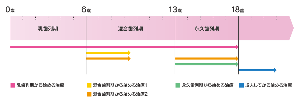 例えば、小学1年生ぐらいで治療が必要な子もいれば、もう少し大きくなって小学6年生ぐらいで始めても十分な場合もあります。逆に、小学6年生や中学生ぐらいで治療を希望する子の場合、「もう少し早く来てくれたら良かったのに」と思うこともあります。また、少ないですが5歳、6歳に開始する必要がある場合もあります。